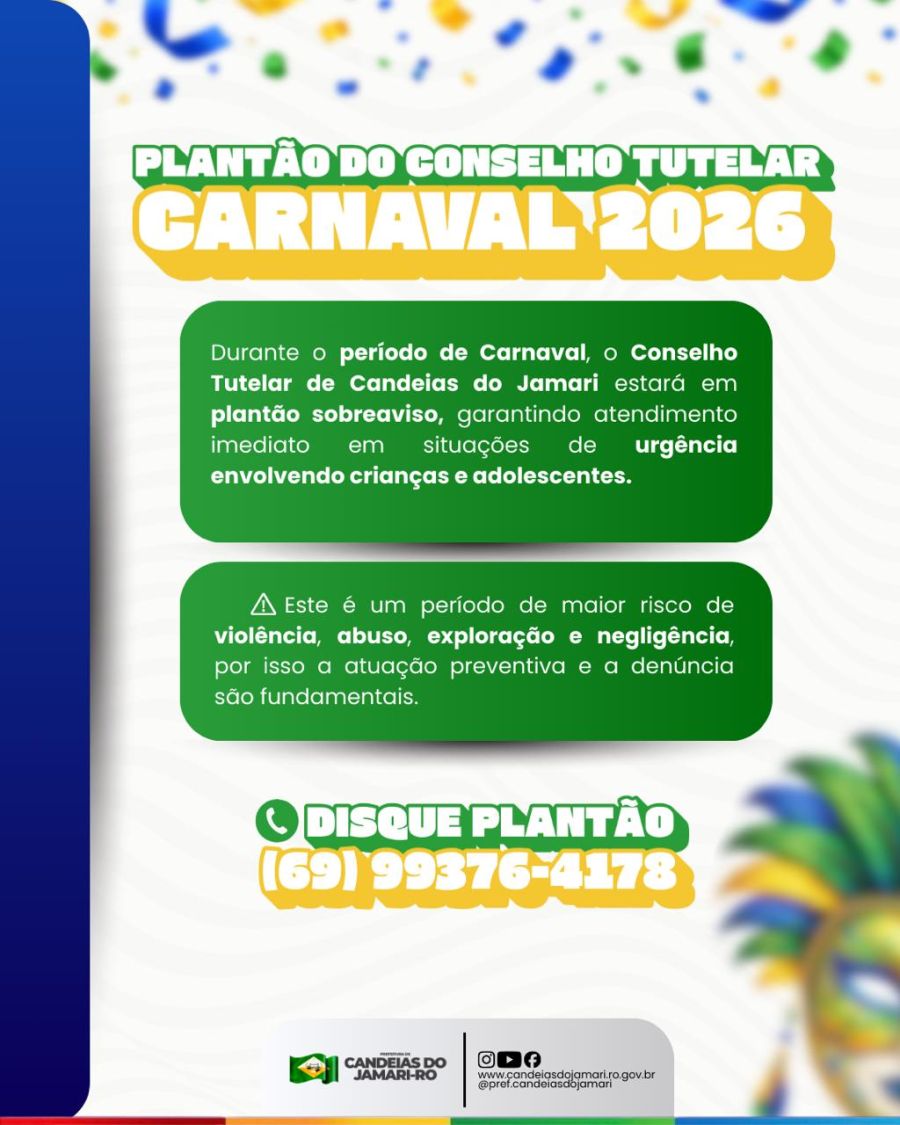 Durante o período de Carnaval de 2026, o Conselho Tutelar de Candeias do Jamari operará em regime de plantão sobreaviso. A estratégia visa assegurar que não haja interrupção no atendimento imediato a situações de urgência envolvendo crianças e adolescentes no município. A manutenção do serviço é essencial para garantir que a rede de proteção aos direitos da infância e juventude permaneça ativa e responsiva durante todos os dias de folia.
