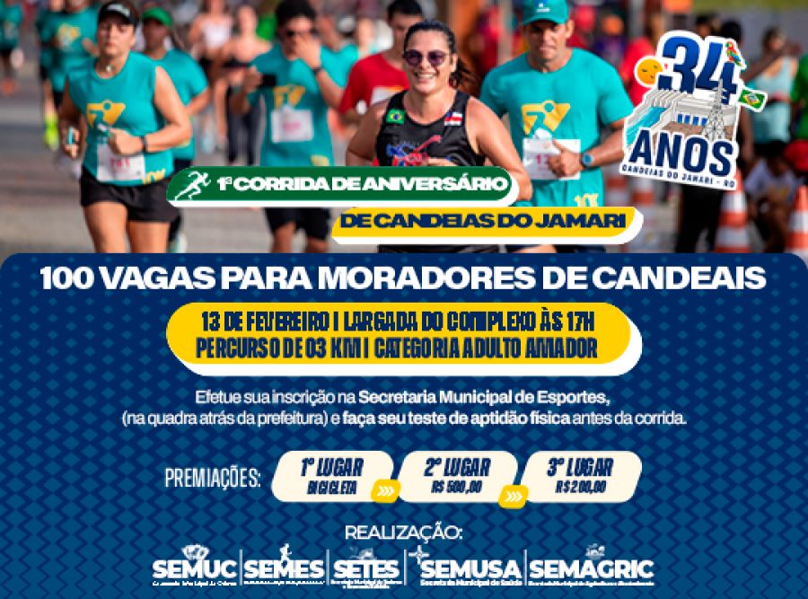 Em comemoração aos 34 anos de emancipação política do município, a Prefeitura de Candeias do Jamari realiza, no dia 13 de fevereiro, a 1ª Corrida de Aniversário. Com largada prevista para as 17h no Complexo Turístico, a prova terá um percurso de 3 km na categoria adulto amador e disponibiliza 100 vagas exclusivas para moradores da cidade, buscando promover a saúde e a integração social por meio do esporte.
